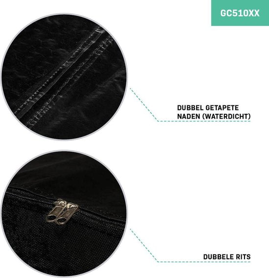 - Das Material ist wasserdicht. Um dies zu gewährleisten, sind alle Nähte und Ecken mit Klebeband geschützt. Bitte beachten Sie, dass der Reißverschluss immer Wasser durchlassen kann. Daher sind diese Aufbewahrungsbeutel nicht wasserdicht um den Reißverschluss herum und wir empfehlen, die Tasche im Schuppen, Abstellraum oder Dachboden zu lagern.