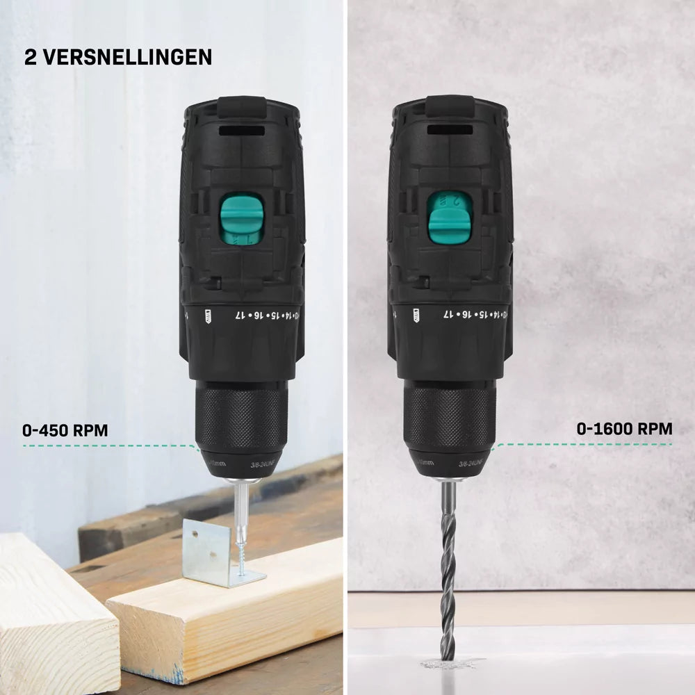 Der CD511DC wird von einem 20V Motor angetrieben, der ein maximales Drehmoment von 40Nm erzeugt. Sie können aus 17 Schraubmodi und einem separaten Bohrmodus wählen, so dass Sie für jedes Material und jede Situation die richtige Einstellung wählen können. Die Drehzahl ist in zwei Modi einstellbar (I: 0-450 und II: 0-1600 U/min) und sorgt für maximalen Bedienkomfort. Der Metall-Schnellspannbohrkopf hat einen Bereich von 0,8 bis 10 mm und ist somit mit allen gängigen Bits und Bohrern kompatibel. So können Sie schnell zwischen verschiedenen Anwendungen wechseln. Von der präzisen Montage bis hin zu schweren Bohrarbeiten passt sich dieses Werkzeug mühelos an. Minimaler Aufwand, maximale Kontrolle!