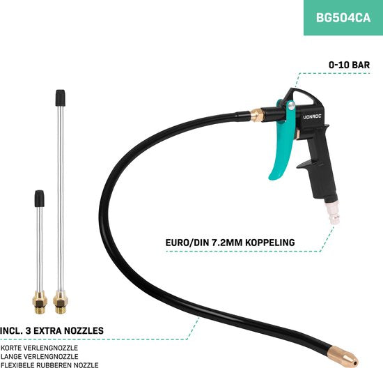 Diese Druckluftpistole ist mit einem universellen EURO/DIN 7,2mm Anschluss ausgestattet und wird mit mehreren praktischen Düsen geliefert: einer kurzen und einer langen Verlängerung sowie einer flexiblen Gummidüse. Dies macht diese kompakte 'Luftblaspistole' sehr vielseitig einsetzbar. Einige Möglichkeiten sind: