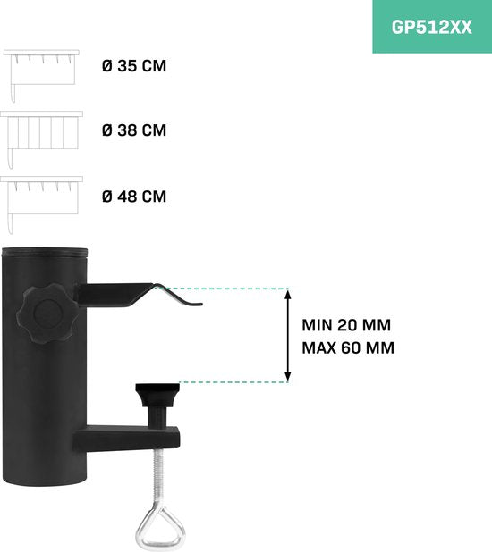 Der Halter ist für die Befestigung von Sonnenschirmstangen in drei verschiedenen Größen ausgelegt. Die Stangenhalterung des Mehrzweck-Sonnenschirmfußes kann problemlos mit verschiedenen Sonnenschirmen verwendet werden.das mitgelieferte Kunststoffzubehör ist für Sonnenschirmstangen mit einem Durchmesser von: 35mm, 38mm oder 48mm. Wir raten davon ab, den Sonnenschirmfuß bei starkem Wind in Kombination mit einem aufgeklappten Sonnenschirm zu verwenden. Außerdem ist es ratsam, den Sonnenschirm aus der Halterung zu nehmen, wenn der Sonnenschirm eingefahren ist und starker Wind weht.