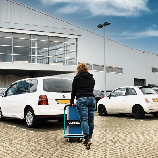 Dieser Transportwagen von VONROC ist das ideale Hilfsmittel für den Transport von schweren und großen Lasten aller Art. Dank des stabilen Stahlbügels lässt sich der Plattformwagen leicht schieben. Die beiden hinteren Gummilenkräder sind um 360° drehbar und geben Ihnen große Bewegungsfreiheit und Wendigkeit.