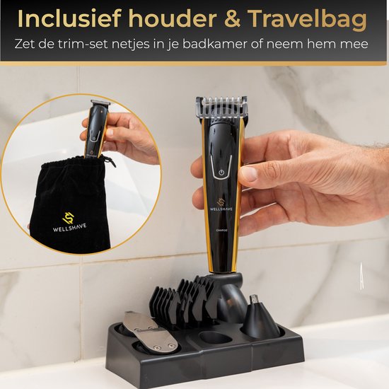 Der Wellshave Barttrimmer und Body Groomer kommt mit 5 Aufsätzen für eine optimale Pflege. Im Lieferumfang enthalten sind außerdem eine praktische Reisetasche und ein Aufsatz mit einer Skala für Längen von 1mm bis 9mm! Der gesamte Trimmer ist spritzwassergeschützt, aber NICHT vollständig wasserdicht. Tauchen Sie das Gerät also nicht ins Wasser oder verwenden Sie es an Orten, an denen es zu viel mit Wasser in Berührung kommt. Alle Aufsätze sind leicht abwaschbar. Wir bieten auch einen Trimmerständer an, in dem Sie alle Aufsätze, das Ladegerät und den Trimmer aufbewahren können. Der Trimmer ist mit einem Li-Ionen-Akku ausgestattet. Laden Sie den Trimmer 2 Stunden lang auf für 1,5 Stunden Betrieb!