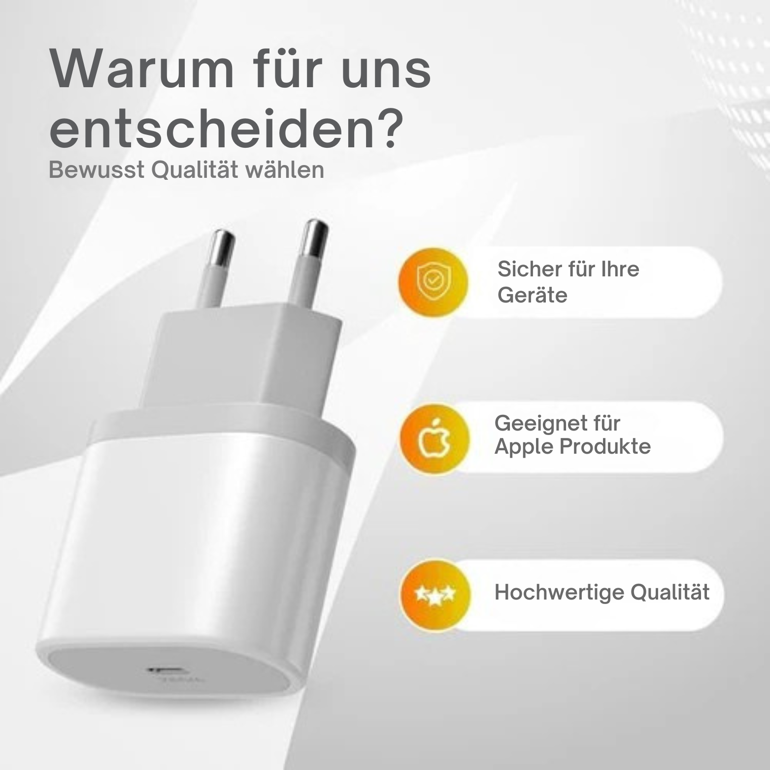 Das Schnellladegerät verwendet die Power-Delivery-Technologie, d. h., es kann die richtige Menge an Strom liefern, die Ihr iPhone oder Tablet benötigt. Dadurch wird sichergestellt, dass die Batterie auf sichere und optimale Weise vollständig aufgeladen wird, ohne dass das Risiko einer Überhitzung oder Beschädigung besteht. Alle unsere Ladegeräte sind absolut sicher in der Anwendung!