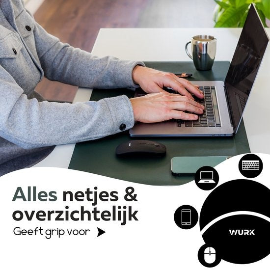 Die professionelle Schreibtischunterlage von Wurk verleiht Ihrem Schreibtisch ein tolles Aussehen! Der Schreibtisch-Organisator sorgt dafür, dass Ihr gesamter Schreibtisch eine schöne, ebene Oberfläche hat. Das macht sie ideal für die Arbeit mit Ihrem Laptop oder Ihrer Tastatur. Die Schreibtischunterlage ist auch eine Computermausunterlage, auf der Laptops und Tastaturen fest auf der Unterlage stehen. Jetzt inklusive USB-Kabelclip. Damit können Sie ganz einfach einige Kabel auf Ihrem Schreibtisch befestigen.