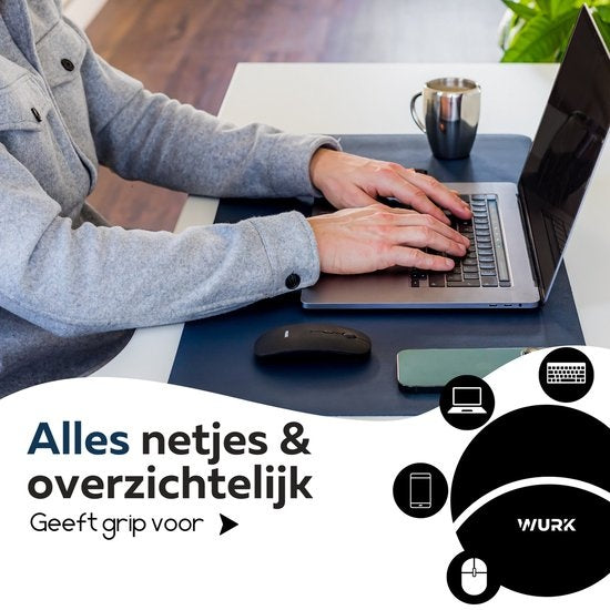 Die professionelle Schreibtischunterlage von Wurk verleiht Ihrem Schreibtisch ein tolles Aussehen! Der Schreibtisch-Organisator sorgt dafür, dass Ihr gesamter Schreibtisch eine schöne, ebene Oberfläche hat. Das macht sie ideal für die Arbeit mit Ihrem Laptop oder Ihrer Tastatur. Die Schreibtischunterlage ist auch eine Computermausunterlage, auf der Laptops und Tastaturen fest auf der Unterlage stehen. Jetzt inklusive USB-Kabelclip. Damit können Sie ganz einfach einige Kabel auf Ihrem Schreibtisch befestigen.
